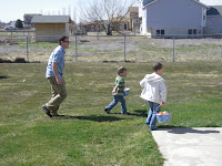 We had a good easter. The boys got a lot of candy and other treats from the two egg hunts they went on. We had one at Brandon's parents house and a flashlight one at my Grandma Clark's house. The black picture with the light blurs is my attempt to get a picture of the flashlight egg hunt. I am kind of sad that Easter is over already. I didn't get enough time to enjoy the delicious Easter candy, which is my favorite.